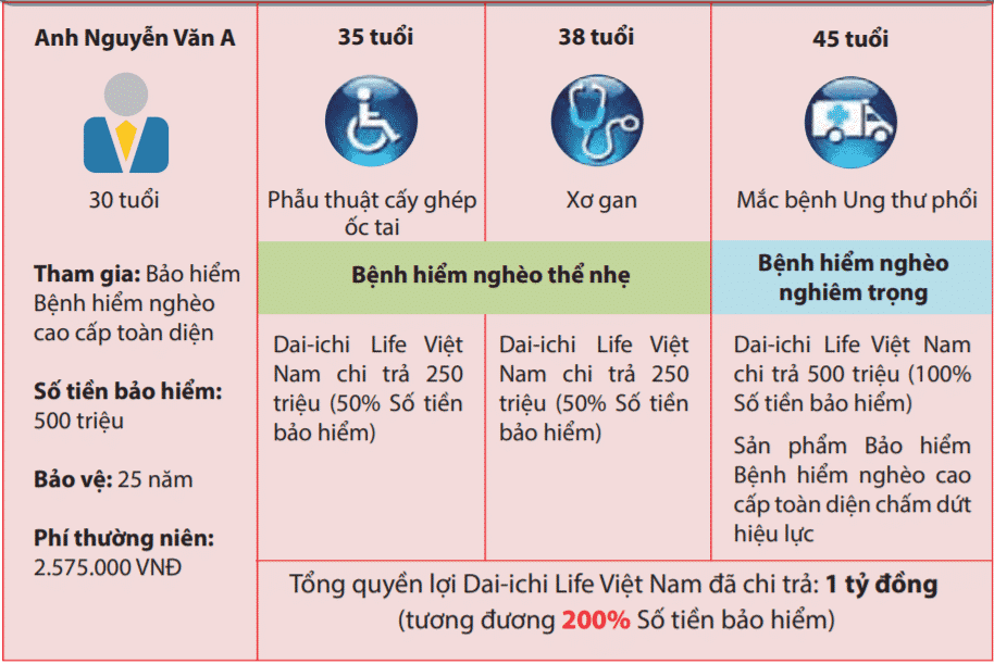 Quyền lợi bảo hiểm được chi trả ở tất cả các giai đoạn từ khi còn ở thể nhẹ đến những bệnh nghiêm trọng giúp khách hàng có cơ hội được điều trị sớm và nhanh chóng bình phục.